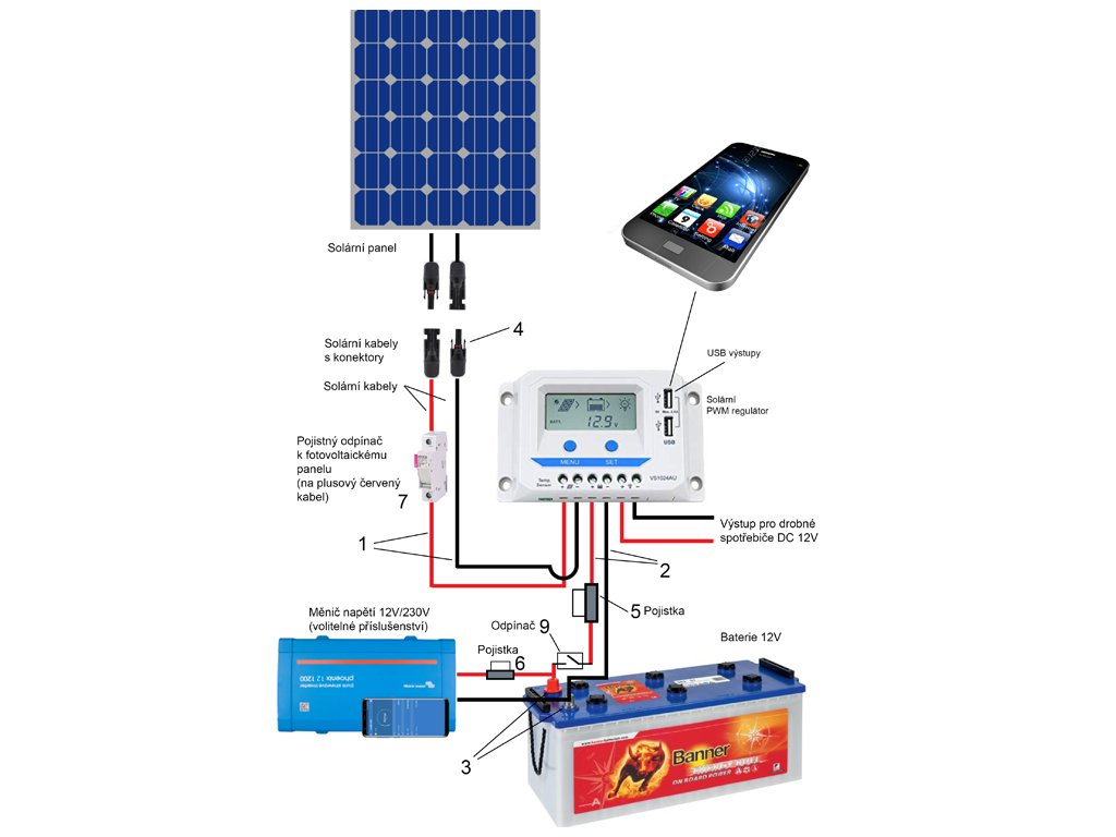 Nejdůležitější ochrana celého systému je pojistka u baterie (5), pojistný odpínač fotovoltaického panelu (7) a odpínač baterie (9). Chrání proti zkratu, navíc obstarávají komfort při plánovaném odpojování systému.