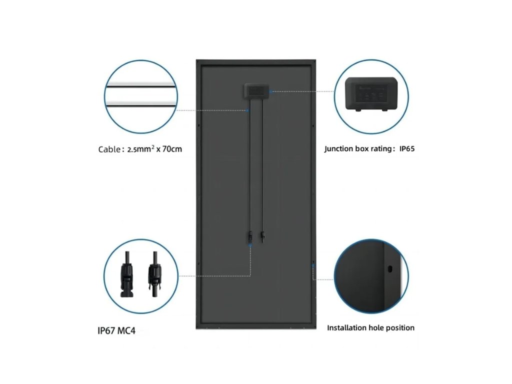 - Panel vysokého výkonu a s rychloupínacím systémem s konektory MC4.